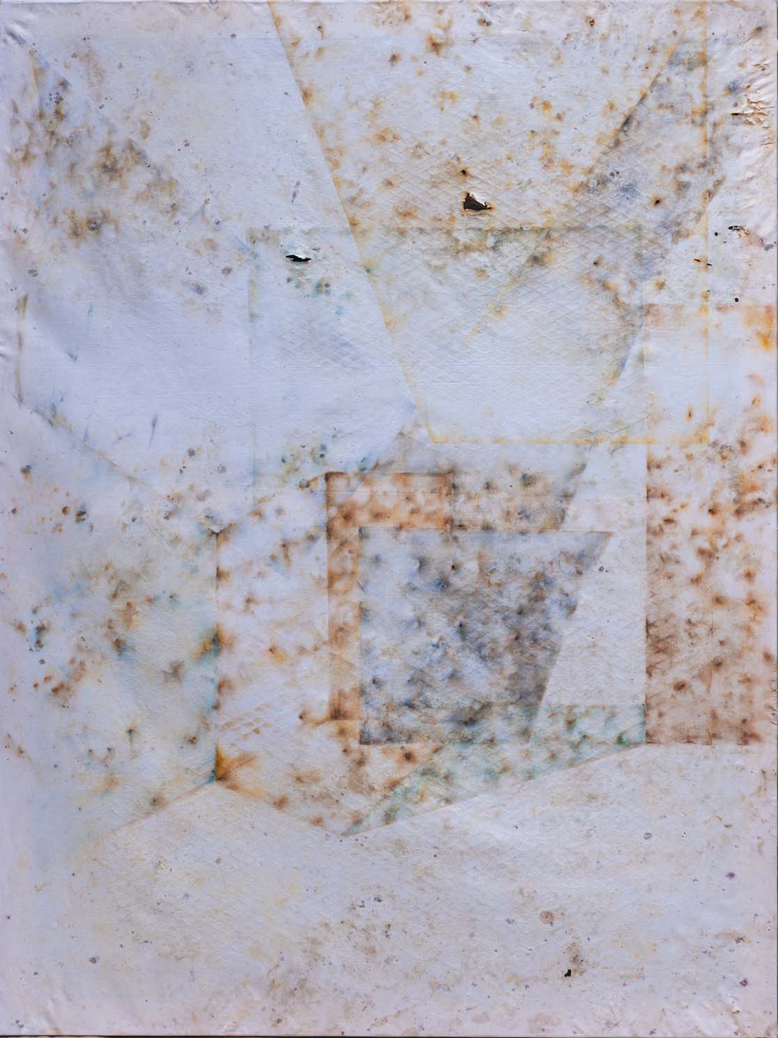 L’opera nasce dall’idea che il tempo non sia una linea retta ma una stratificazione di tracce, impronte e dissolvenze che si depositano sulla materia: una superficie che custodisce segnali adottati dalla natura e che vengono poi rivissuti attraverso un intervento pittorico.